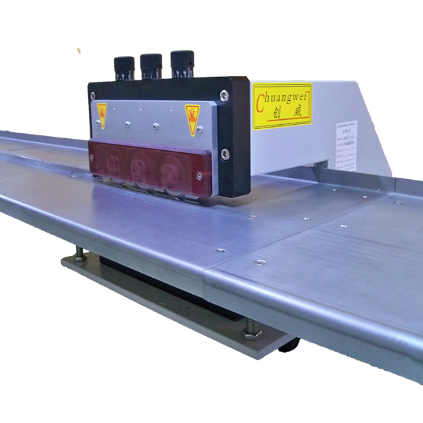 二,多刀式走板LED鋁基板分板機(jī),CWVC-3S(此種分板機(jī)型號可以說是在CWVC-1S上進(jìn)行的必要有利的改良,能更好的保證分板的變形度,控制分板應(yīng)力,減小分板機(jī)刀片的磨損等,特別擅長于分切各種長的LED鋁基板,如0.8m,1.2m,2m,4m等LED鋁基板,至今為至此型號已成功用于中山,天津,江蘇等地的多家LED行業(yè)客戶。配備有標(biāo)準(zhǔn)的1.2米平臺及2.4米平臺供選擇。)